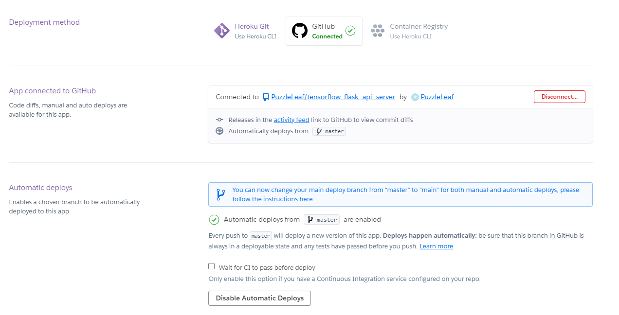 Heroku 페이지에서 프로젝트를 생성하고 Github과 연동해서 배포 설정을 할 수 있습니다.